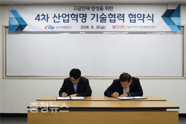 한국서부발전 김경재 기술본부장(오른쪽)과 서울대 EDRC 이종민 소장이 업무협약에 서명하고 있는 모습