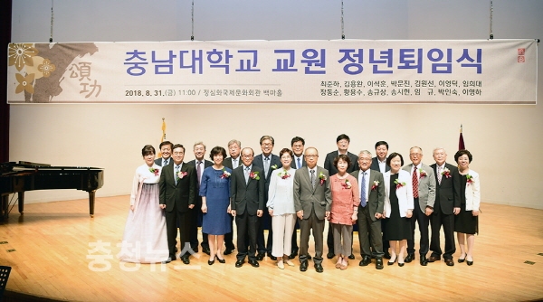 충남대는 31일 정심화국제문화회관 백마홀에서 최준하, 김용완, 이석훈, 박문진, 김원선, 이영덕, 임희대, 장동순, 황용수, 송규상, 송시헌, 임규, 박인숙, 이영하 교수에 대한 정년퇴임식을 개최했다.