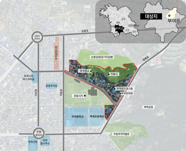 사업대상지는 부여읍 동남리 445-1번지 일원으로 면적 93,010㎡ 동남리 향교마을이다.
