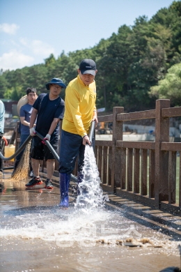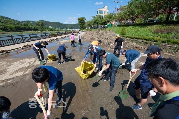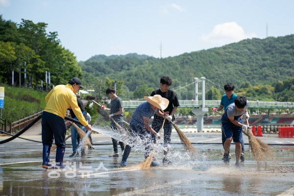 대신 1일 뿌리공원 하상도로와 주차장을 100여명의 구 직원들이 자발적으로 나서며 복구활동을 펼쳤다.