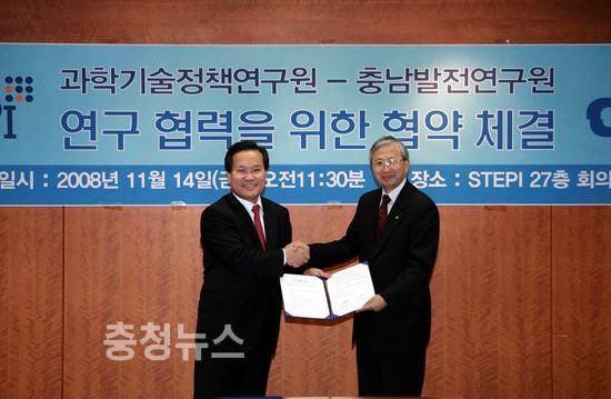충남발전연구원(원장 김용웅)과 과학기술정책연구원(원장 김석준.STEPI)이 14일 서울 동작구 신대방동 과학기술정책연구원 회의실에서 연구협력을 위한 협약을 체결했다. ▲ 충남발전硏-과학기술정책硏 연구협력 협정 이에 따라 양 기관은 ▲공통 연구과제 발굴 및 공동연구 수행 ▲특화된 지식정보 상호교류 및 확산 ▲연구자 역량 강화를 위한 공동 세미나 개최 등에 나서게 된다. 김용웅 충남발전연구원 원장은 "국내 최고의 과학기술정책 연구기관과 공동연구에 나서면 경쟁력 있는 정책을 개발하는 데 큰 도움이 될 것"이라며 "충남발전연구원도 STEPI가 좋은 연구를 할 수 있도록 다양한 정보를 제공하겠다"고 말했다. 저작권자 © 충청뉴스 무단전재 및 재배포 금지 성재은 기자 다른기사 보기 기사가 마음에 드셨나요? 충청뉴스 좋은 기사 후원하기 1,000원 3,000원 5,000원 10,000원 30,000원 50,000원 직접입력 비회원 약관동의하기 ※ 소중한 후원금은 더 좋은 기사를 만드는데 쓰겠습니다.