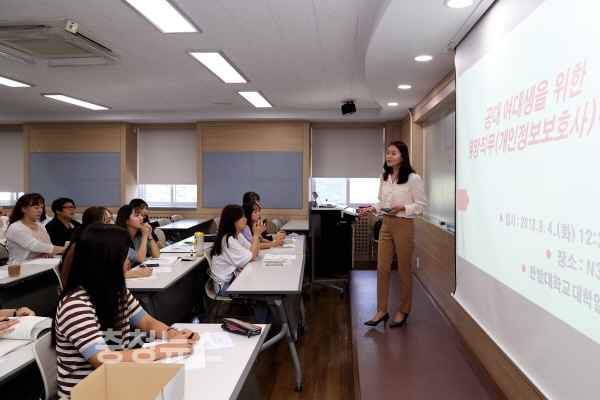한밭대학교 대학일자리본부에서 ‘공대 여대생을 위한 유망직무 특강’에서 개인정보보호사에 대한 직무를 소개하고 있다