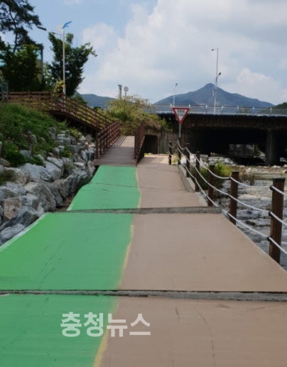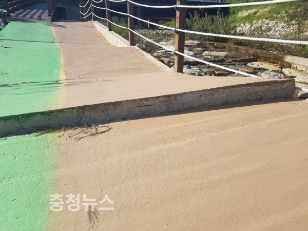 덕명교 산책로 포장이 뜯어진 채로 방치된 모습 / 충청뉴스 김용우 기자