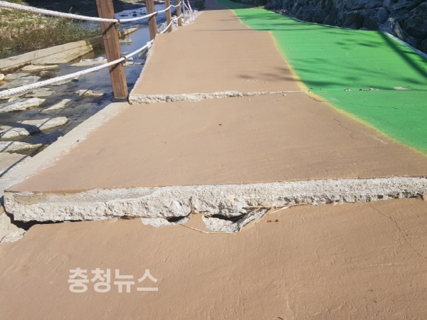 인근 주민 김 씨는 “도로 포장(산책로)이 완전히 뜯어졌지만 주의하라는 내용이 적힌 현수막이 하나 없다”며 “야간에 사람들이 주의할 수 있도록 야광 삼각대라도 설치해 줬으면 좋겠다”고 말했다.
