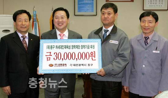 대전 동구 차세대인재육성장학재단(이사장 이장우 동구청장)은 18일 ㈜신화금속(대표 정찬욱)이 동구청을 방문해 지역 우수인재 육성을 위한 장학금에 써 달라며 3천만원을 기탁했다고 밝혔다.