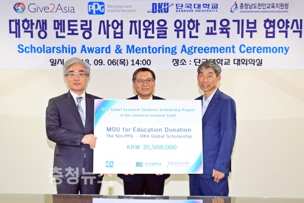 단국대학교(총장 장호성)는 지난 6일 천안캠퍼스 인문관 대회의실에서 교육기부 멘토링 사업을 위한 협약식과 장학증서 수여식을 가졌다. 행사에는 단국대 김수복 부총장, 장원철 교무처장, 문명진 자연과학대학장을 비롯한 대학 관계자와 천안교육지원청 허삼복 교육장, 도종곤 PPG 코리아 대표이사 등 교육청과 기업 관계자들이 참석했다.