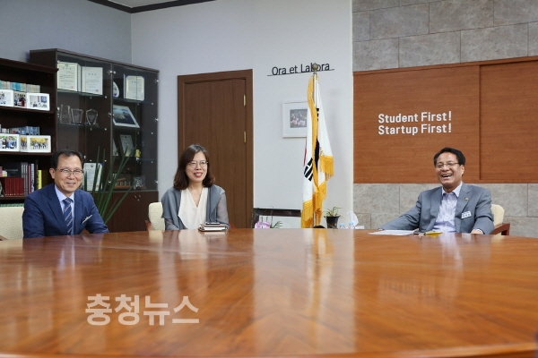 한남대 이덕훈 총장(오른쪽)이 김혜숙 부장(가운데)을 격려하고 있다.