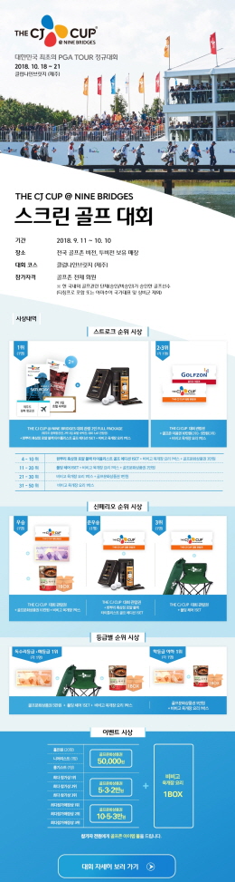 ㈜골프존(대표이사 박기원)은 11일부터 오는 10월 10일까지 한 달간 ‘더 CJ컵 @ 나인브릿지 (THE CJ CUP @ NINE BRIDGES) 스크린골프대회’와 ‘CJ 비비고 풍선 이벤트’를 동시에 개최한다고 밝혔다. 코스는 골프존의 ‘클럽나인브릿지(제주)’다.