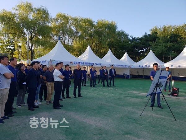 10일 오전 6시 30분 구본영 시장(천안문화재단 이사장)을 비롯한 천안시 간부공무원 110여명과 천안문화재단 직원 30여명은 축제의 주행사장인 천안삼거리공원에서 성공적인 축제 개최를 위한 준비를 완료했다.