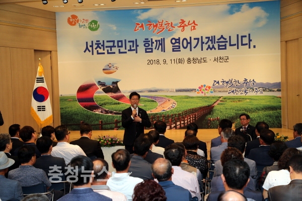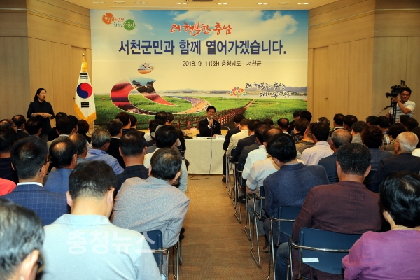 노박래 서천군수는 환영인사를 통해 “우리 군 발전을 위해 오전부터 함께 해주신 양승조 도지사님께 감사드리고, 오늘 편안한 시간 가운데 우리 군민들과 함께 군 발전 방향에 대해 이야기 나누는 시간이 되길 바란다”고 전했다.