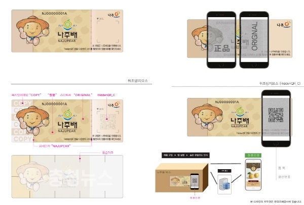 ‘나주배 브랜드 도용 방지 라벨’은 조폐공사의 특허기술인 복사방해패턴을 적용해 복사해 사용할 경우 ‘COPY’ 문구가 나타나 정품이 아님을 알 수 있다. 또 스마트폰 앱인 ‘Hidden QR’을 활용, QR코드에 라벨을 비추면 정품 나주배 여부를 바로 확인 가능하다.