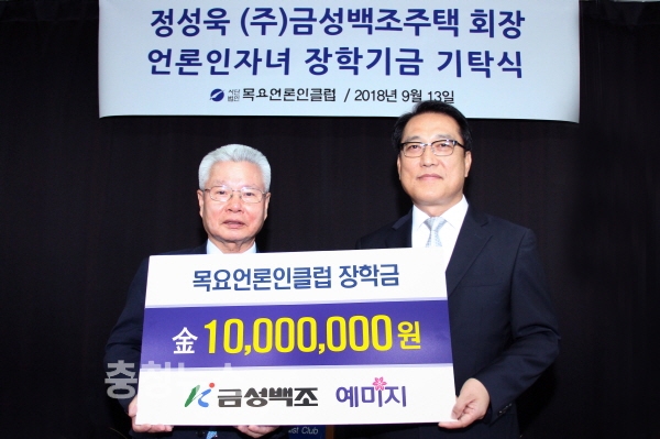 금성백조주택(회장 정성욱)이 목요언론인클럽(회장 곽영지)에 언론인 자녀 장학금으로 써달라며 1천만 원을 기탁했다.