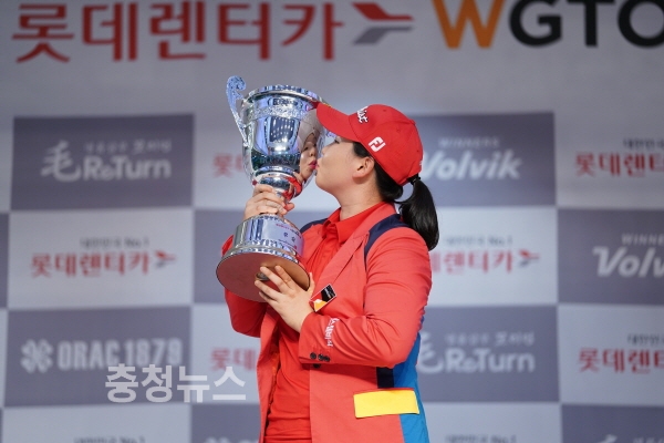 ‘2018 롯데렌터카 WGTOUR 정규투어 6차 대회’에서 우승자 정선아 선수가 우승컵에 입을 맞추고 있다.