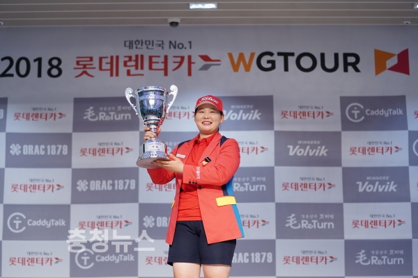 ‘2018 롯데렌터카 WGTOUR 정규투어 6차 대회’에서 우승자 정선아 선수가 우승컵을 들고 있다.