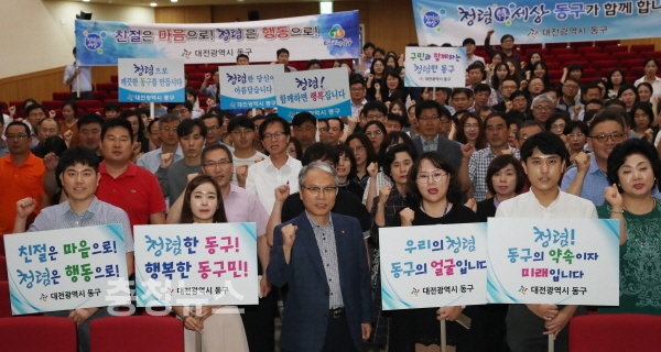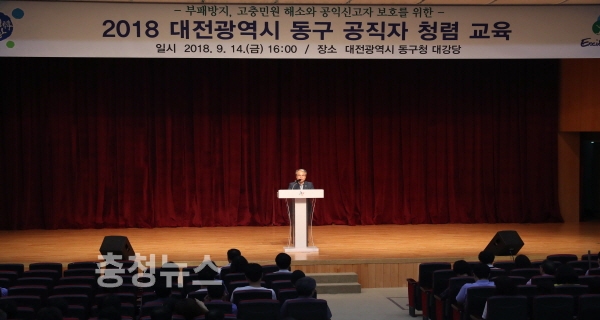 대전 동구(구청장 황인호)는 공직자 청렴마인드 향상 및 부패방지를 위해 지난 14일 구청 대강당에서 직원 450여 명을 대상으로 ‘투명한 조직, 세상을 바꾸는 청렴!’을 주제로 공직자 청렴 교육을 개최했다.