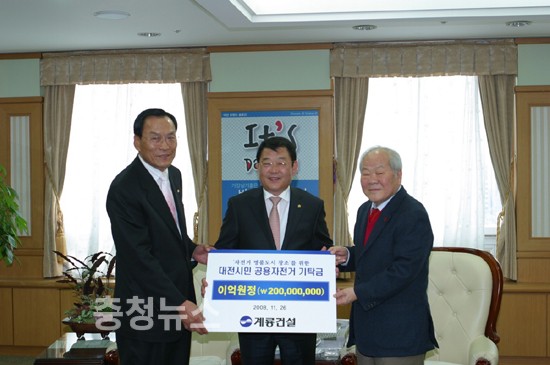 계룡건설(명예회장 이인구)이 26일 ‘자전거타기 좋은 도시 만들기’ 실현을 위해 대전사랑시민협의회(회장 홍성표)에 성금 2억원을 전달했다.