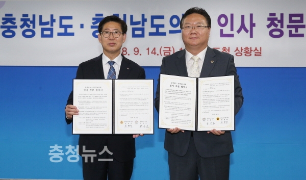 양승조 충남도지사와 유병국 충남도의회 의장은 지난 14일 ‘충남도 공공기관장 인사청문 협약’을 체결했다.