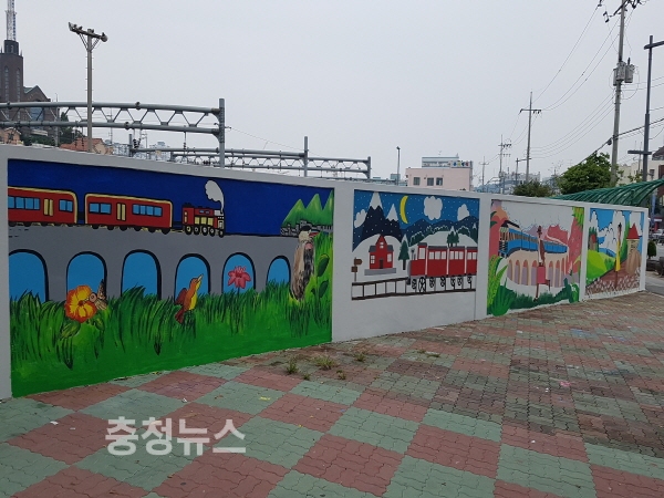 신탄진동, 칙칙폭폭 담장 위 달리는 '열차벽화' 눈길