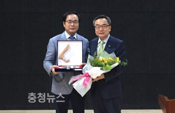 윤영균(우측) 한국산림복지진흥원장이 최근 부산 동서대학교 센텀캠퍼스에서 '2018 한국정책학회 정책대상'을수상한 뒤 명승환 한국정책학회장과 기념촬영