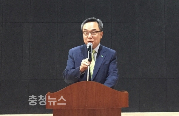 윤영균(우측) 한국산림복지진흥원장이 최근 부산 동서대학교 센텀캠퍼스에서 '2018 한국정책학회 정책대상 수상소감을 말하고 있는 모습