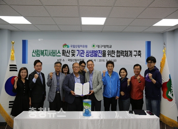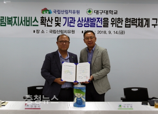 산림청 한국산림복지진흥원(원장 윤영균)은 대구대학교(총장 김상호)와 경북 영주시 봉현면 국립산림치유원에서 ‘산림복지서비스 확산, 산림을 통한 국민의 행복증진·삶의 질 향상 및 기관발전을 위한 업무협약(MOU)’을 체결했다고 17일 밝혔다.