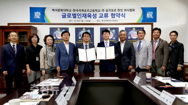 백석문화대학교와 한국국제조리고등학교, 주 싱가포르 한인 외식협회는 17일 오전 경북 영주 한국국제조리고등학교에서 ‘글로벌인재육성교류 협약’을 체결했다.