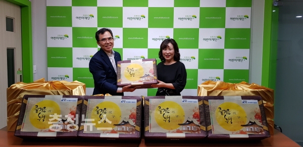 추석을 맞아 철도공단 전만경 부이사장(사진 왼쪽)이 초록우산 어린이재단 박미애 대전지역본부장(사진 오른쪽)에게 후원물품을 전달했다