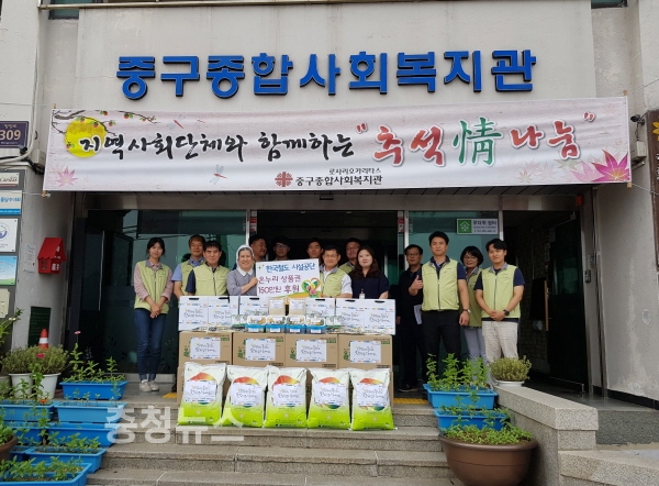 추석을 맞아 철도공단 석호영 영남본부장(왼쪽 8번째)이 부산중구종합사회복지관 가밀라 수녀(왼쪽 4번째)에게 후원물품과 후원금을 전달했다