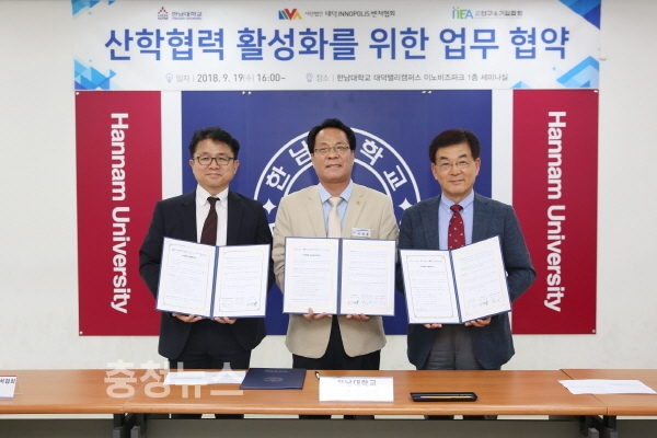 이날 한남대는 대덕밸리캠퍼스 이노비즈파크와 창조관 세미나실에서 (사)대덕이노폴리스벤처협회, (사)연구소기업협회와 산학협력 협약을 체결했다.