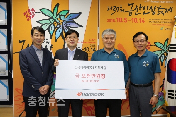 한국타이어(대표이사 조현범)는 20일 충남 금산군청에서 문정우 금산군수, 최창희 한국타이어 금산공장장 및 관계자 등이 참석한 가운데 ‘2018 금산인삼축제’의 성공적인 개최를 기원하기 위한 후원금 5000만원을 전달했다.