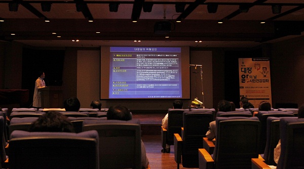 가톨릭대 대전성모병원 소화기내과 문성진 교수가 28일 오후 병원 9층 대강당에서 열린 '대장앎의 날 시민 건강강좌'에서 대장암의 선별 검사 및 내시경적 치료를 주제로 강의를 했다.  시민 건강강좌는 대장암의 수술적 치료를 비롯한 5가지 주제의 강의와 대장암 식단에 대한 영양상담으로 진행됐다.