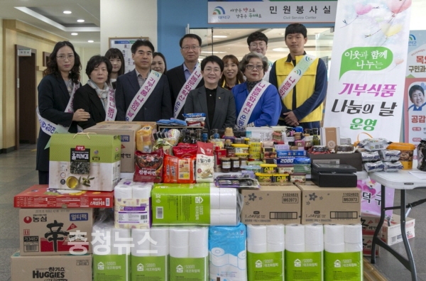 대덕구 직원들이 기부식품 나눔의 날을 맞아 구청 로비에 차려진 행사장에 준비한 생필품 등을 기탁하며 이웃사랑을 실천했다.