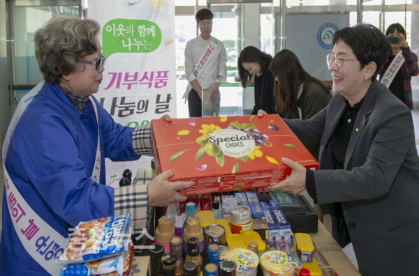 기부식품 나눔의 날 행사에 참석해 준비한 생필품을 기탁하는 박정현 대덕구청장(오른쪽)