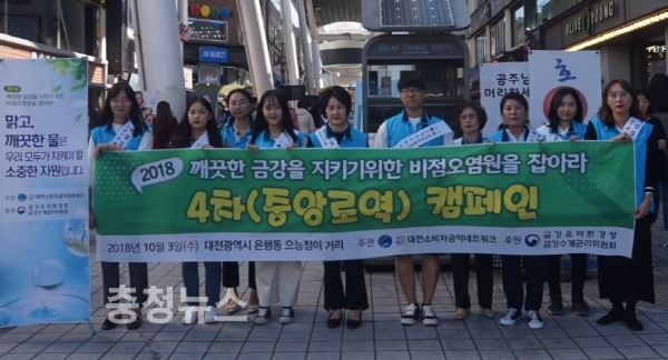 (사)대전소비자공익네트워크(회장 도정자)는 금강유역환경청(청장 김동진)의 후원을 받아 3일 대전 은행동 으능정거리에서 일반시민 500명 대상으로 ‘깨끗한 금강을 지키기 위한 비점오염원을 잡아라! 4차(중앙로역) 홍보 캠페인’을 열었다.