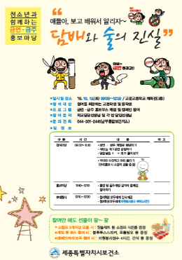 세종시보건소(소장 이강산)가 ‘청소년과 함께하는 금연·금주 홍보마당’ 행사를 추진한다.