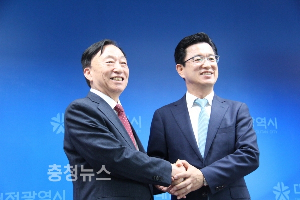 설동호 교육감(왼쪽)과 허태정 시장(오른쪽)이 악수를 하고 있다.