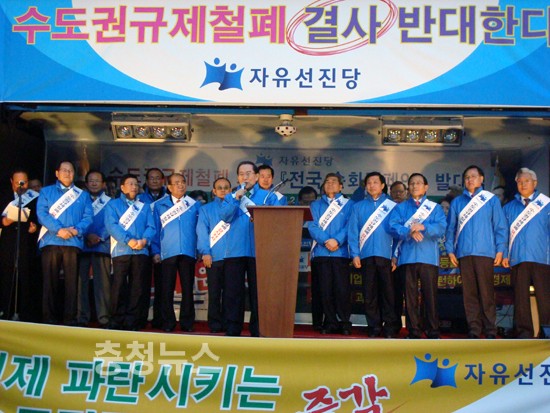 그래서 우리 충청권에서는 우리 자유선진당이 수도권규제를 막으려는 우리 충청도 경제를 살리고 서민도 잘 사는 수도권규제완화 철폐를 위해 추운 겨울날 여러분께 호소하기 위해 왔다면서 수도권규제완화를 철폐하는 데 동참을 해 달라고 강조했다.