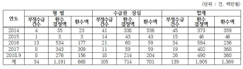 한편, 최근 5년간 사학연금을 부정하게 받았다가 적발된 사례는 139건, 적발금액은 19억500만 원으로 이 가운데 미환수액은 전체의 28.1%(5억3600만 원)로 나타났다.