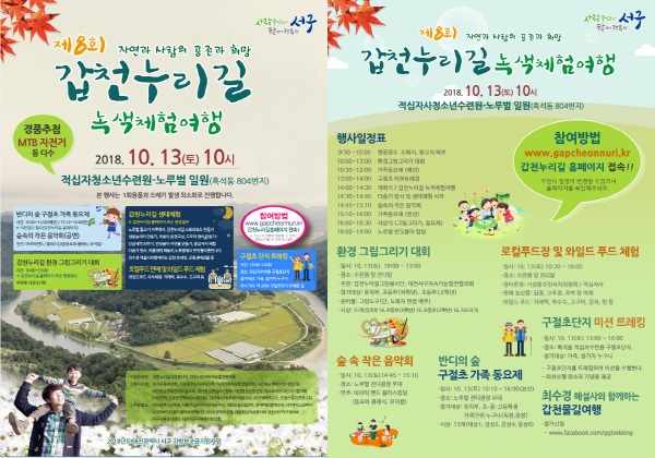 제8회를 맞이한 이번 행사는 ‘갑천누리길그린봉사단’과 ‘대전서구지속가능발전협의회’에서 주관하고 대전을 대표하는 환경․시민단체가 자연과 환경을 소재로 한 다양한 프로그램을 진행한다.