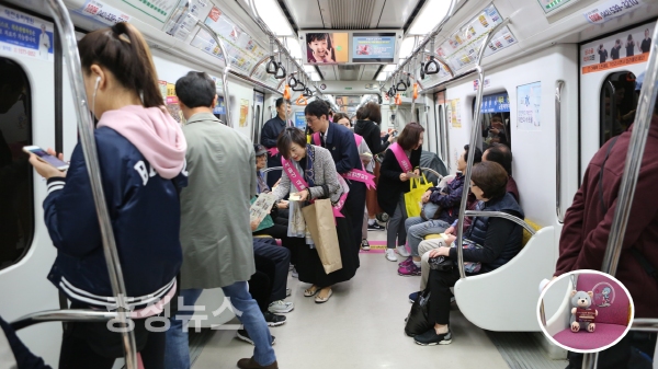 참가자들은 도시철도를 이용하는 시민에게 열차 내 임산부석과 곰인형의 의미를 알리는 홍보물을 나눠주고 임산부에 대한 관심과 배려를 호소했다.