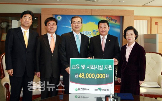 충청하나은행 최임걸 대표는 10일 대전시청을 방문해 대전 도심외곽의 벽지학교인 동구 추동 동명초등학교, 대덕구 장동초등학교와 사회복지시설 3곳에 올해 연말까지 총 4천800만원의 기부금을 전달할 것을 밝혔다.
