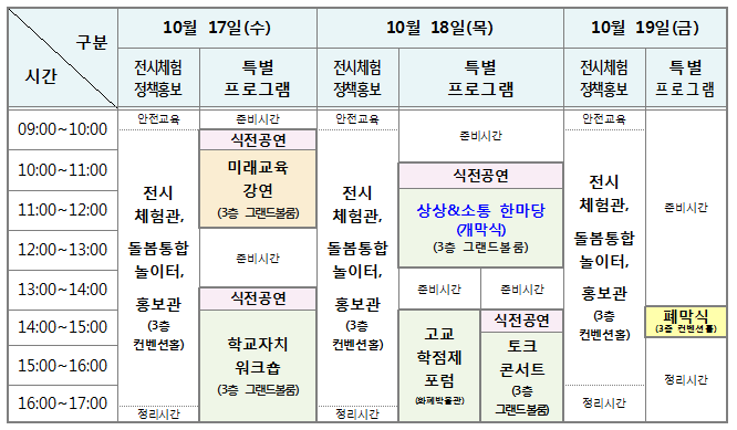 특히, 그간 분산 운영하던 방과후학교박람회, 교육과정 페스티벌, 자유학기제 및 창의인재 씨앗학교 성과보고회 등의 행사를 통합 운영했다.