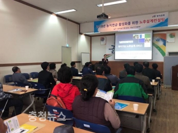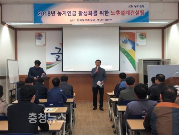 한국농어촌공사 공주지사(지사장 김남표)는 12일 지사 회의실에서 고령 농업인의 안정적 노후생활과 농지은행사업 홍보를 위한 ‘노후설계컨설팅’을 개최했다.