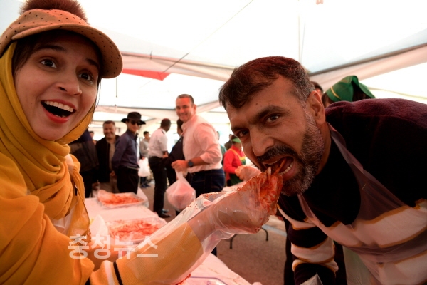 강경젓갈축제를 방문한 외국인이 김치담그기 행사에 참여하고 있다.
