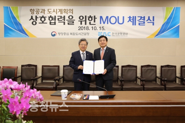 행복청(청장 이원재)과 한국공항공사(사장직무대행 김명운)는 15일 청주공항에서 상호 협력체계 구축을 위한 업무협약을 체결했다.