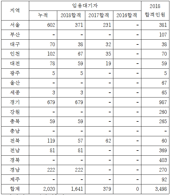 특히, 서울(231명), 전북(62명) 대구(32명) 인천(35명), 대전(19명)에서는 작년에 합격한 인원들조차 내년까지 발령지를 기다려야 하는 실정이다.
