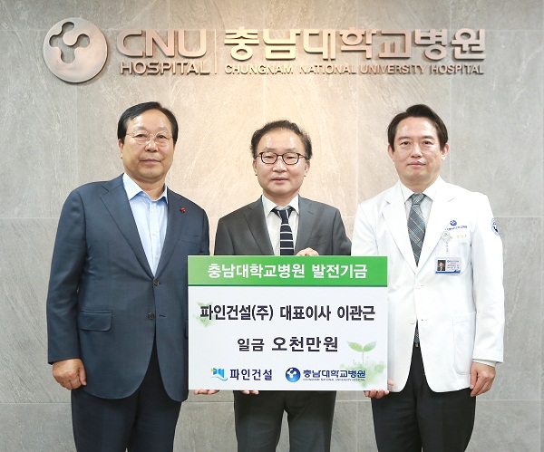 파인건설(주) 이관근 대표이사는 15일 충남대병원에 병원 발전기금 5000만 원을 기부했다.