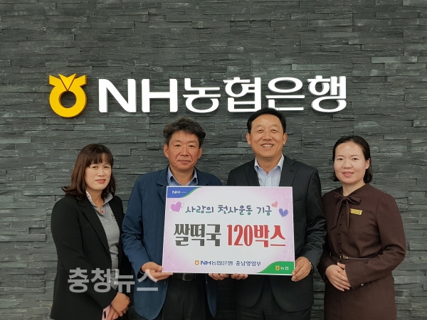 NH농협은행 충남영업부(부장 홍순광)는 홍성군장애인후원회(회장 이병석)에 쌀떡국 120박스(120만원)을 후원하는 ‘사랑의 천사운동’ 기금 전달식을 가졌다고 15일 밝혔다.