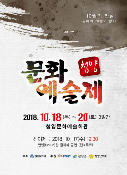 청양문화원은 오는 18일부터 20일까지 3일간 청양문예회관에서 ‘2018 청양문화예술제’를 개최한다.