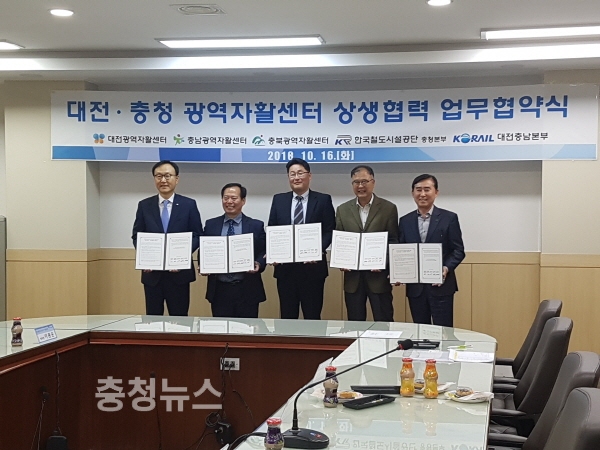 한국철도시설공단 충청본부(본부장 이종윤)는 지역사회의 저소득 취약계층을 대상으로 자활기반 조성사업을 지원하기 위해 한국철도공사 대전충남본부, 대전·충남·충북 광역자활센터와 16일 철도공사 대전충남본부(대전시 동구 정동 소재)에서 상호협력을 위한 협약을 체결했다고 밝혔다.